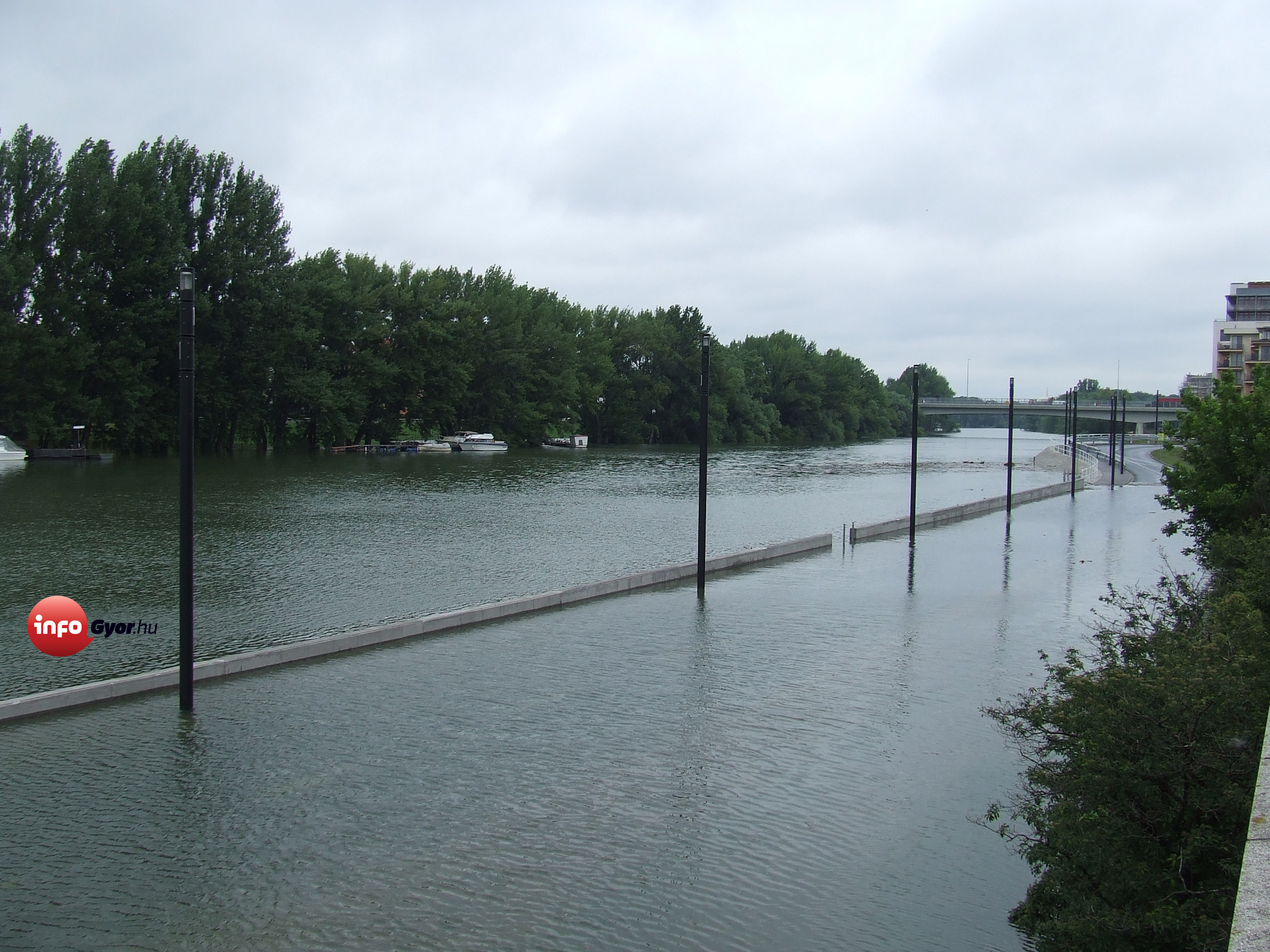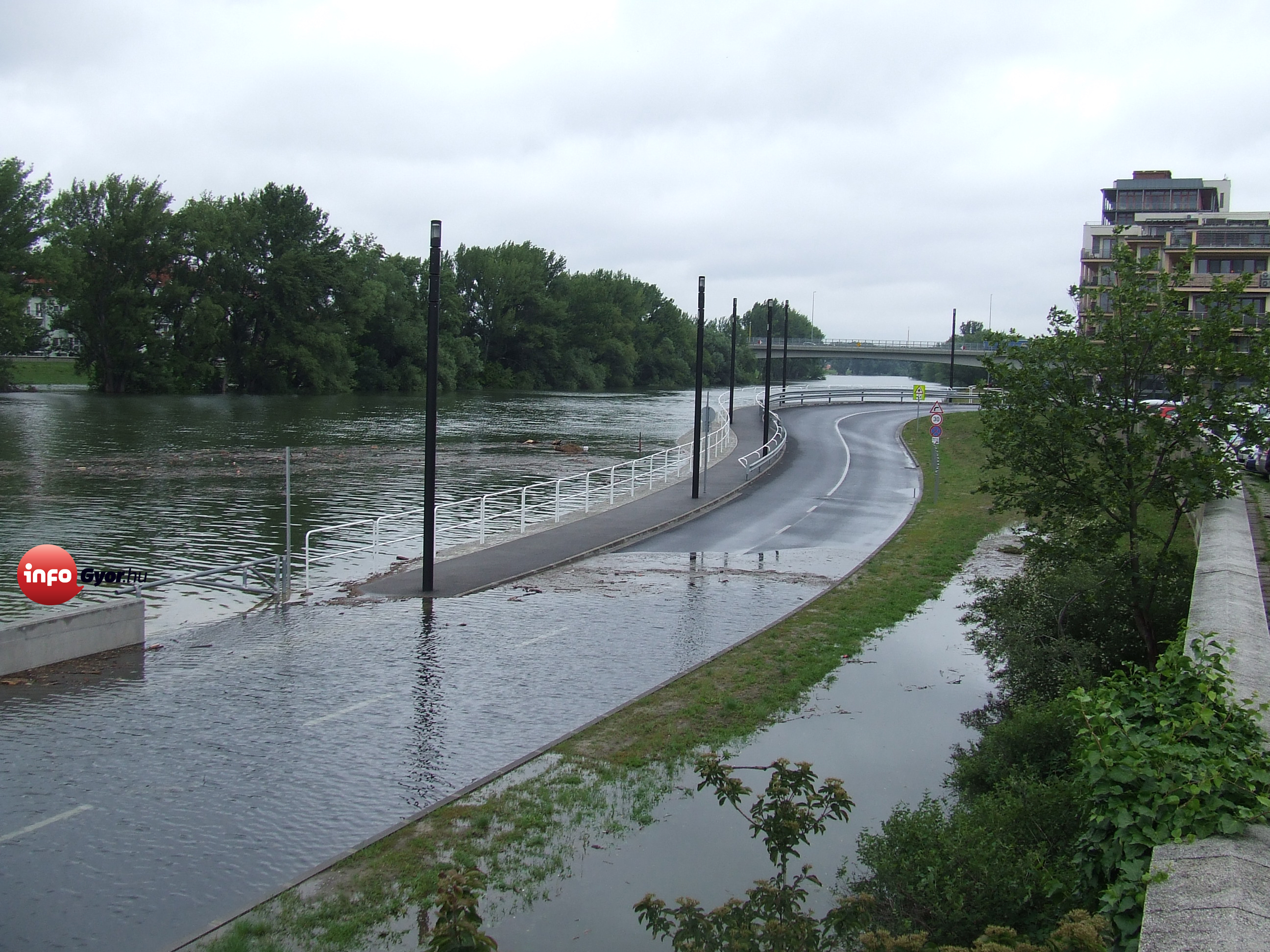A Duna által elöntött Móricz Zsigmond rakpart Győrben.A miniszterelnök az árvíz miatt vészhelyzetet hirdetett Győr-Moson-Sopron és Komárom-Esztergom megye egészére, valamint Pest megye és a főváros egyes területeire.