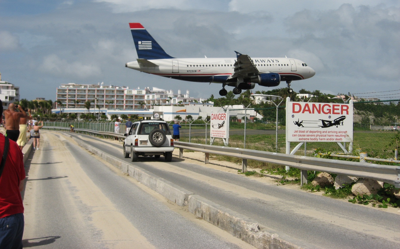 Félelmetes és nem is veszélytelen a St. Maarten szigetére érkező repülőgépek. Hihetetlen közel repülnek el az emberek felett, de a turistákat ez nem zavarja, sőt inkább vonzza őket. A veszély annyira valós, hogy külön tábla figyelmezteti a strandolókat, hogy a repülőgépek turbinájának erős szele, akár el is lökheti őket. Délelőtt tizenegy és délután három között számos gép érkezik, illetve indul, nem kevés zajjal.