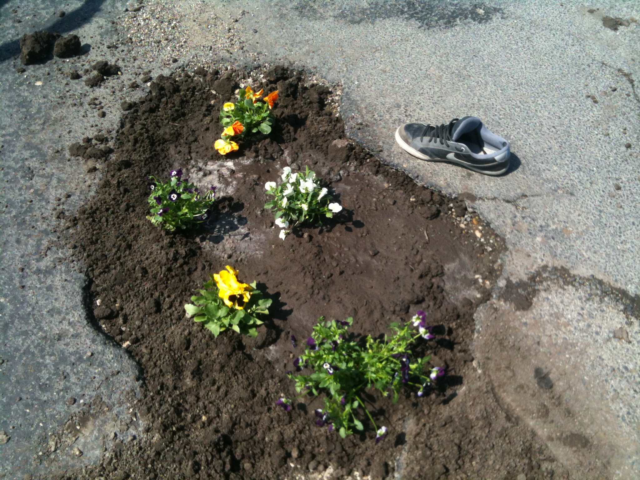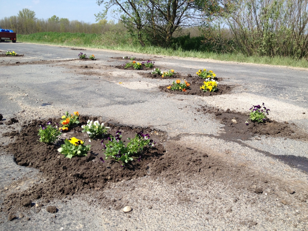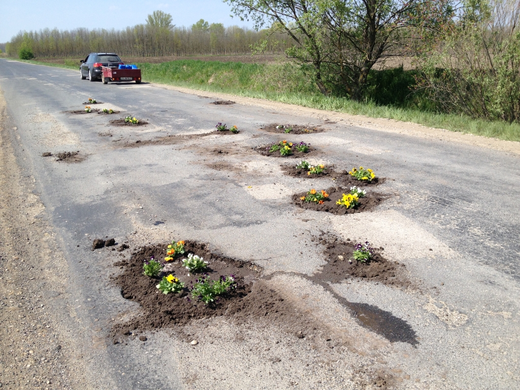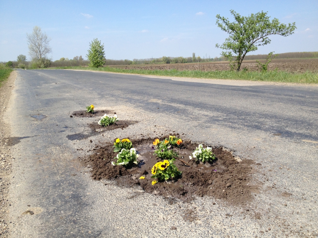 Olvasónk által küldött fotók a koronói úton készültek, ahol valaki/valakik virágot ültettek a kátyúkba, figyelemfelhívás gyagyánt.