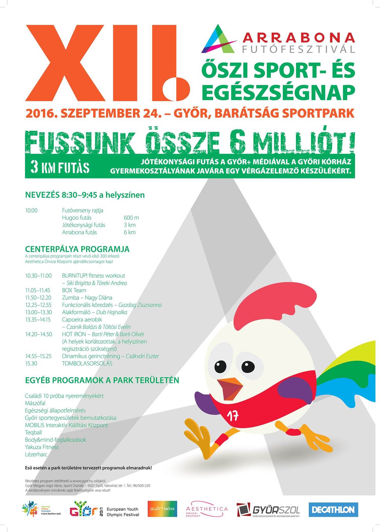 A XII. Arrabona Futófesztivál, Őszi Sport- és Egészségnap keretében szombaton, 2016. szeptember 24-én kerül megrendezésre a hagyományos Arrabona futás a győri Barátság Sport-parkban.